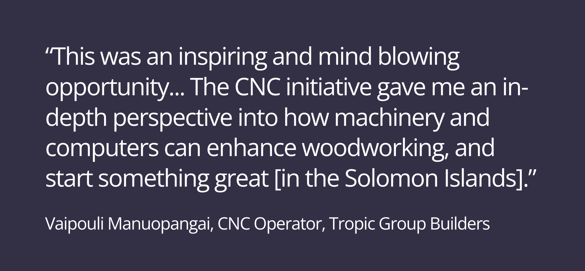 “This was an inspiring and mind-blowing opportunity that I truly appreciate being a part of. It has given me an in-depth perspective into how machinery and computers can enhance woodworking, giving me a broader idea of woodworking in the Solomon Islands and how these machines can start something great.”